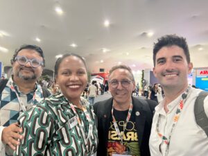 Rui Leão (China), Caroline Marie Calixte (Guiana), Odilo Almeida Filho (Brasil) e David Fontcuberta (Martinica) durante encontro na Zona Azul da COP30.