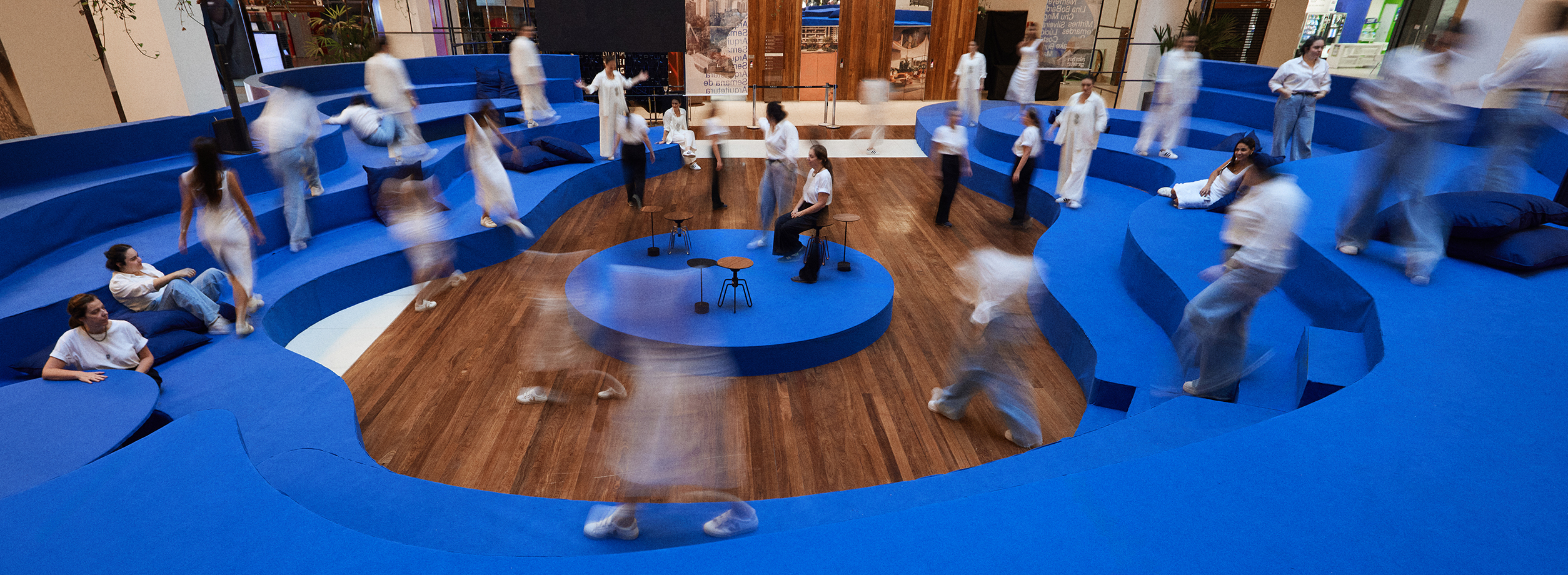 O espaço central, desenhado segundo princípios de desenho universal, acomodava múltiplos usos — palestras, convivência e descanso — permitindo diferentes graus de aproximação, de quem participava de perto ou observava dos pavimentos superiores. Sob o tema Abrangente, as paredes da arena assumiram função expositiva, apresentando processos de concepção e a história local, visíveis a quem transitava pelo shopping e dialogando com a identidade visual do evento.