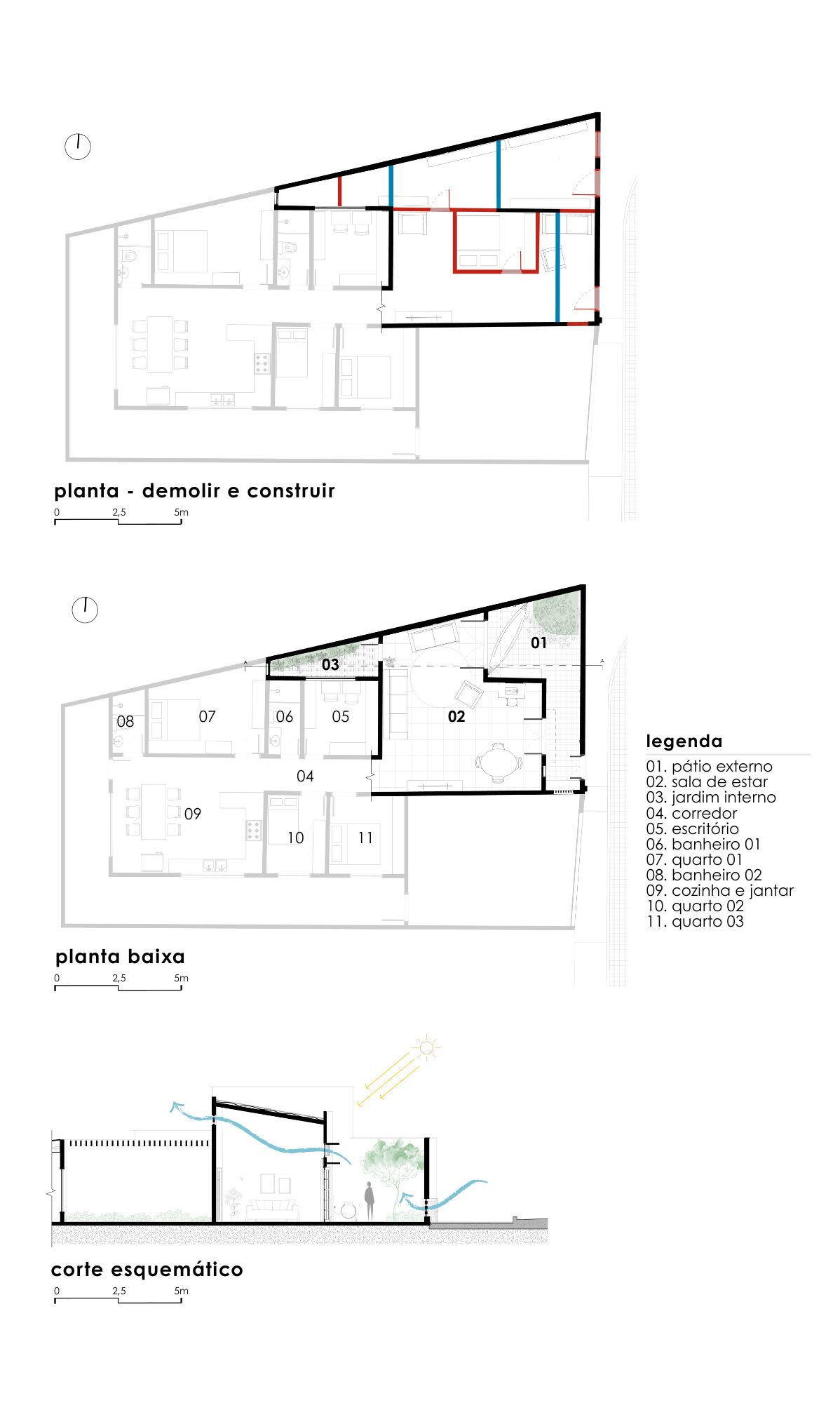 Cinco ambientes subutilizados foram demolidos para permitir uma sala ampla, um jardim interno e um terraço aberto, potencializando o caráter de sociabilidade que a casa já possuía. As portas de entrada, agora restauradas, são protegidas por placas de concreto pré-moldado, utilizadas aqui como brises horizontais de baixo custo; o mesmo elemento também conforma os bancos do terraço aberto.