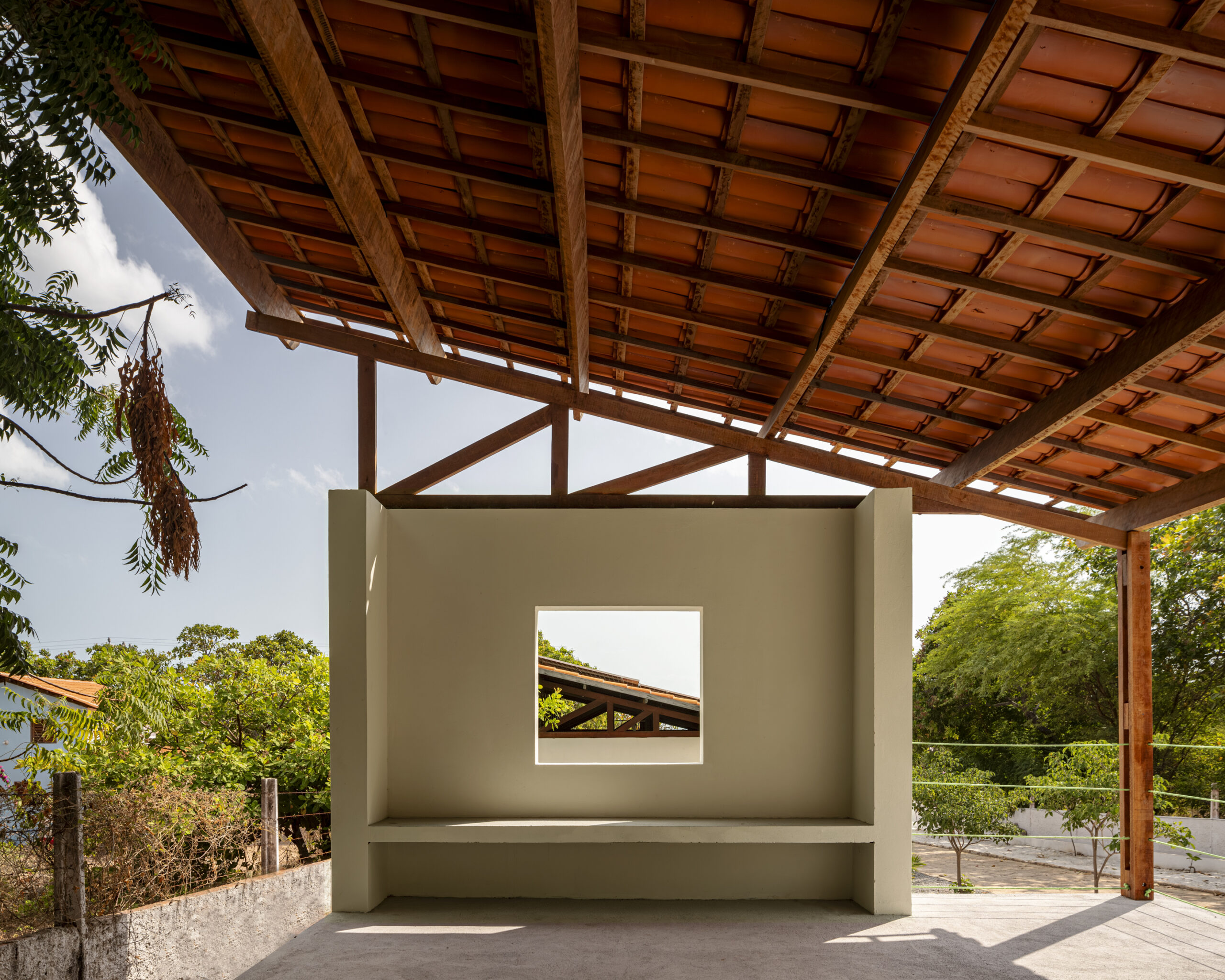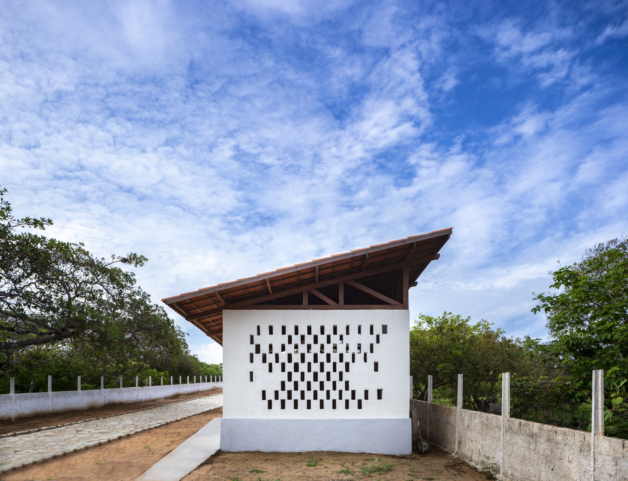 Foram construídos dois blocos: um pavilhão fechado destinado a exposições e outro, mais aberto, voltado a atividades coletivas e suporte de infraestrutura. Os fluxos internos do terreno e o muro de acesso também foram redesenhados. Trata-se de um projeto contínuo, que se desenvolve no tempo e permanece aberto à expansão. A arquitetura dialoga com referências das casas tradicionais de fazenda de gado na região do Jaguaribe, adotando planta retangular, sombreamento perimetral, cobertura em telha cerâmica e pintura em cal, além de aberturas verticais alongadas. O processo produtivo se aproxima do saber dos mestres-carpinteiros locais, incorporando inclusive a tolerância ao erro como diretriz de projeto.