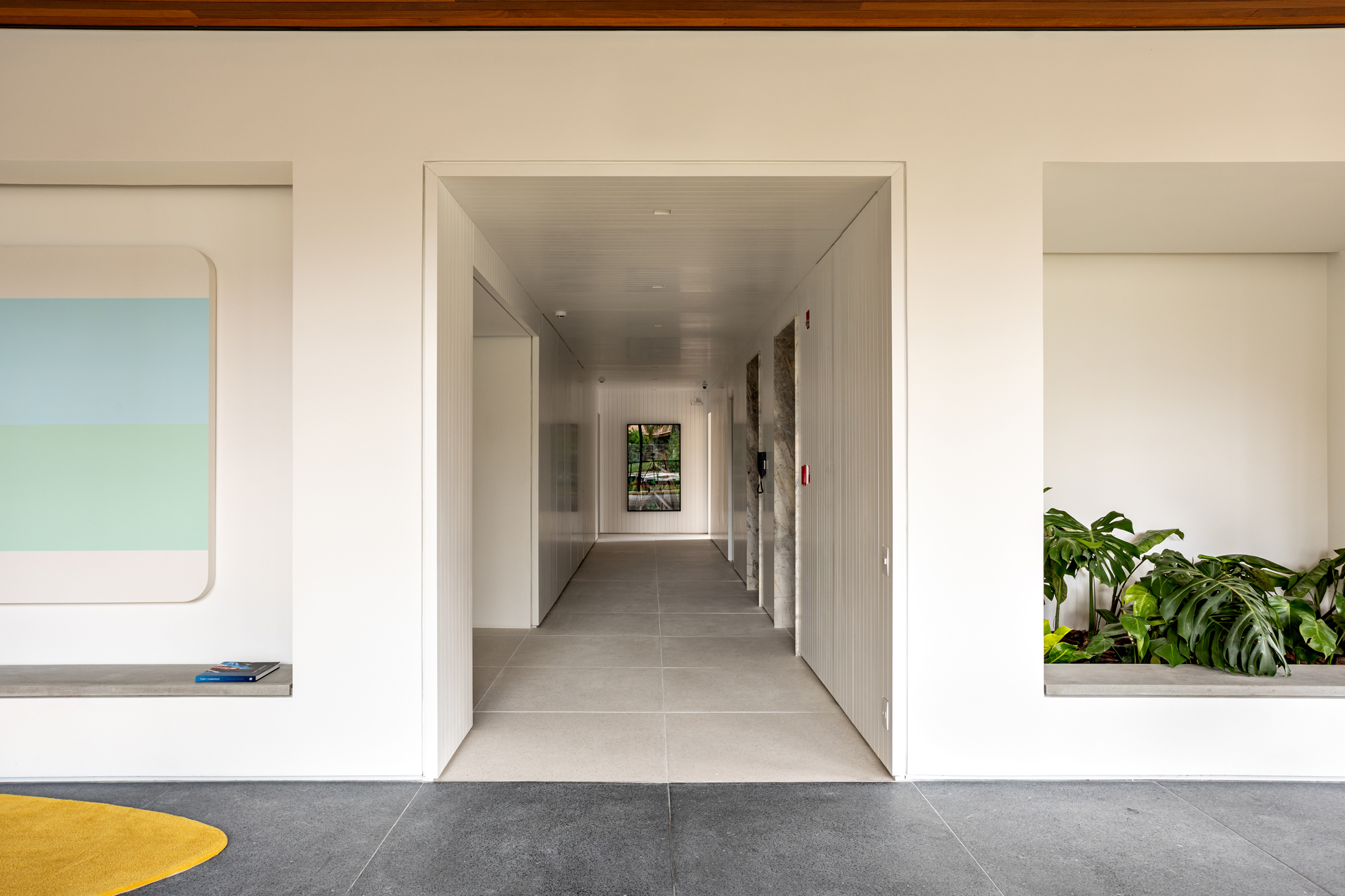 A linguagem dos outros ambientes se conecta ao conjunto: o piso amarelo da academia retoma o tapete do hall, e a brinquedoteca, revestida com o mesmo painel frisado branco do hall de elevadores, combina proporções e elementos do método Montessori.