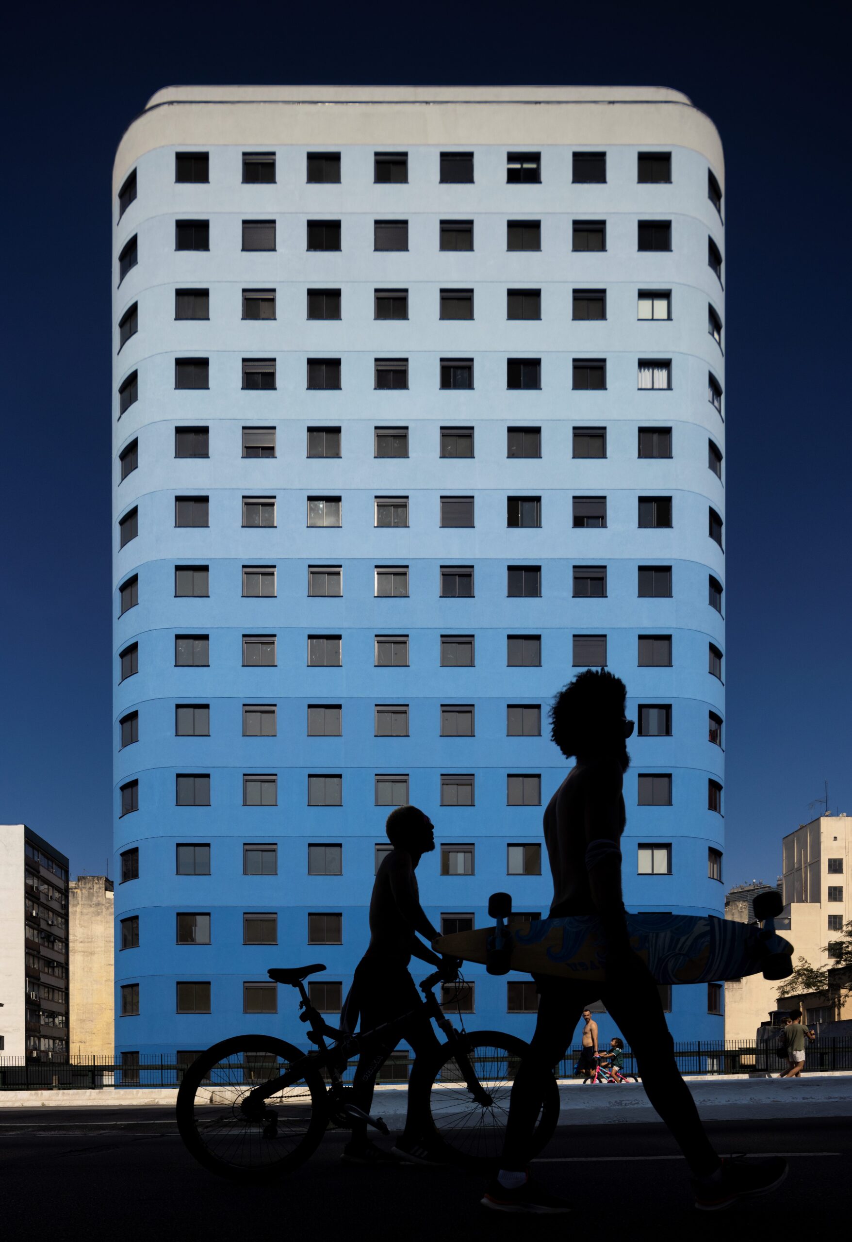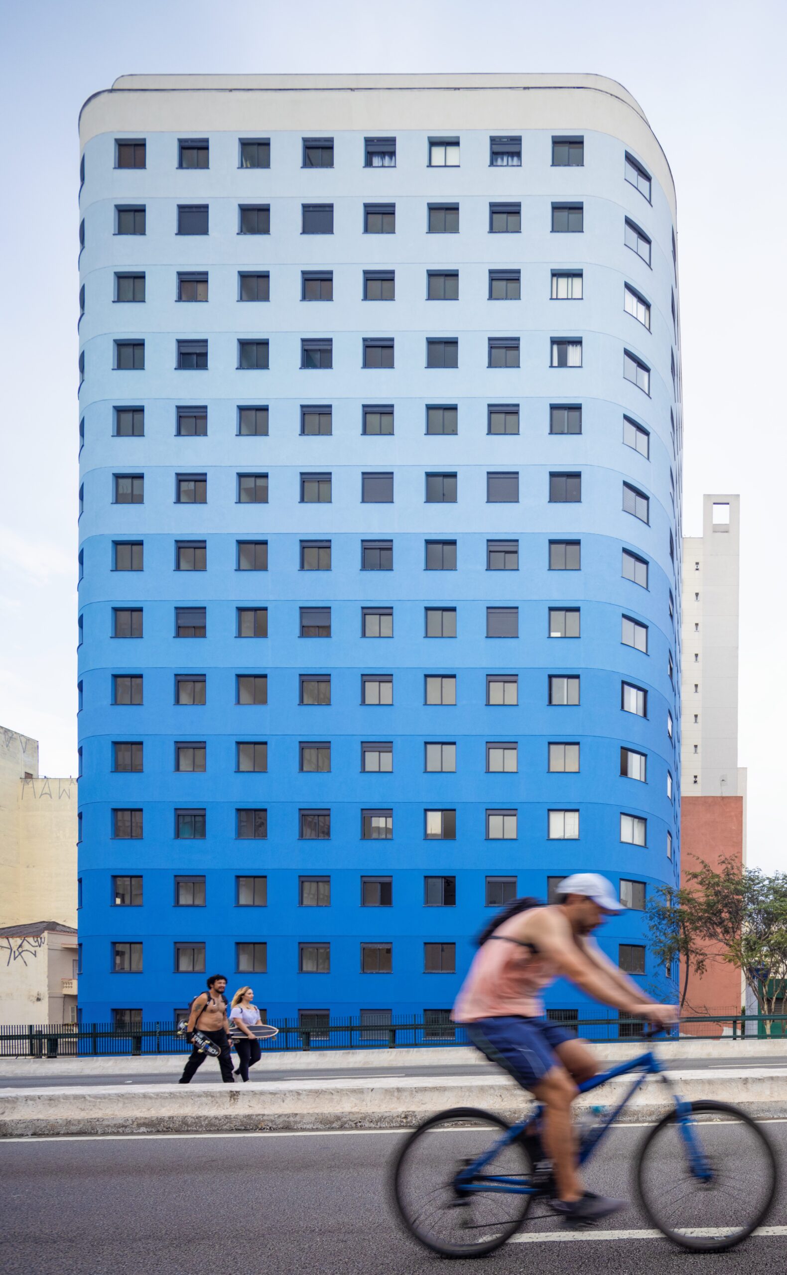 A forma curva da esquina inspirou o arredondamento dos cantos do edifício, reforçando a suavidade volumétrica. A extensa fachada é marcada pelo degradê de quinze tons de azul, do mais escuro no térreo ao branco no último pavimento. Os espaços comuns foram distribuídos na cobertura, incluindo salão de festas, lavanderia, salas de trabalho, áreas verdes e horta, oferecendo a todos os moradores vista ampla da cidade e um ambiente de convívio protegido do ruído urbano.