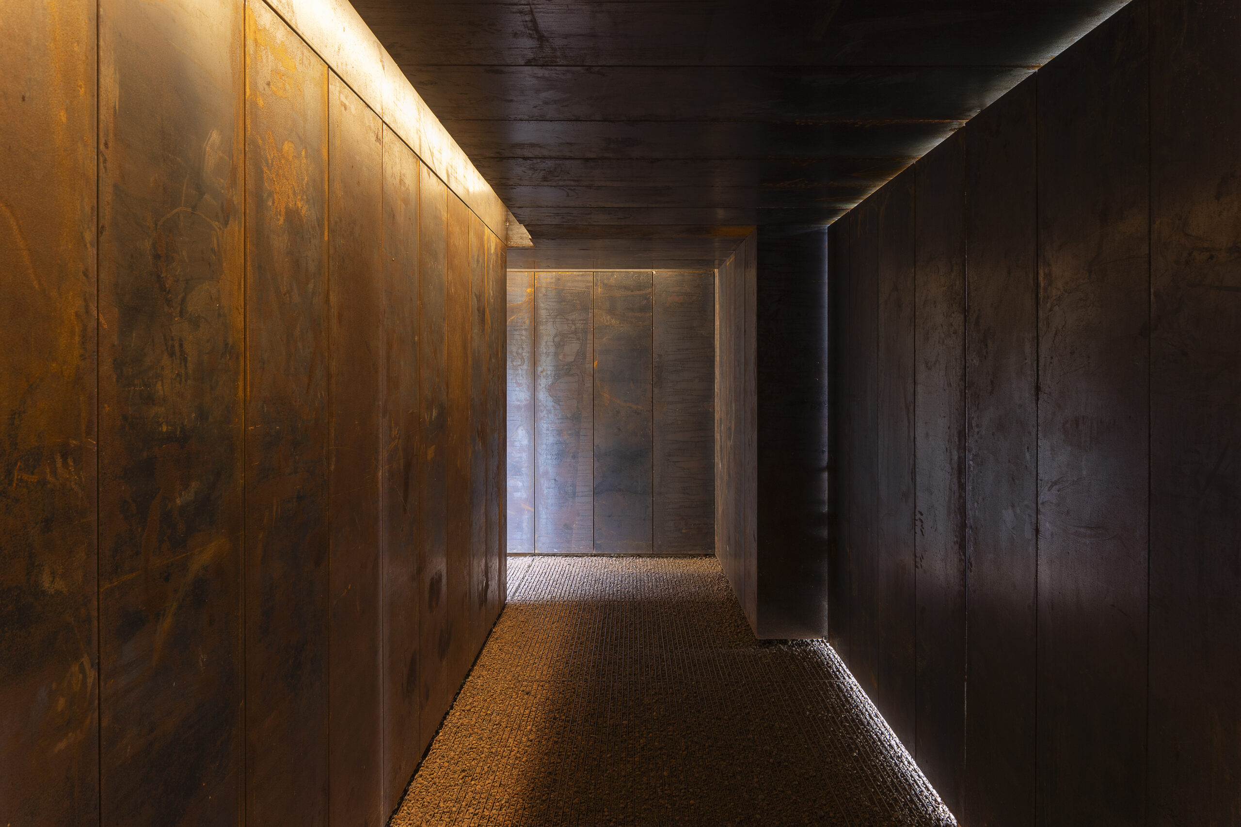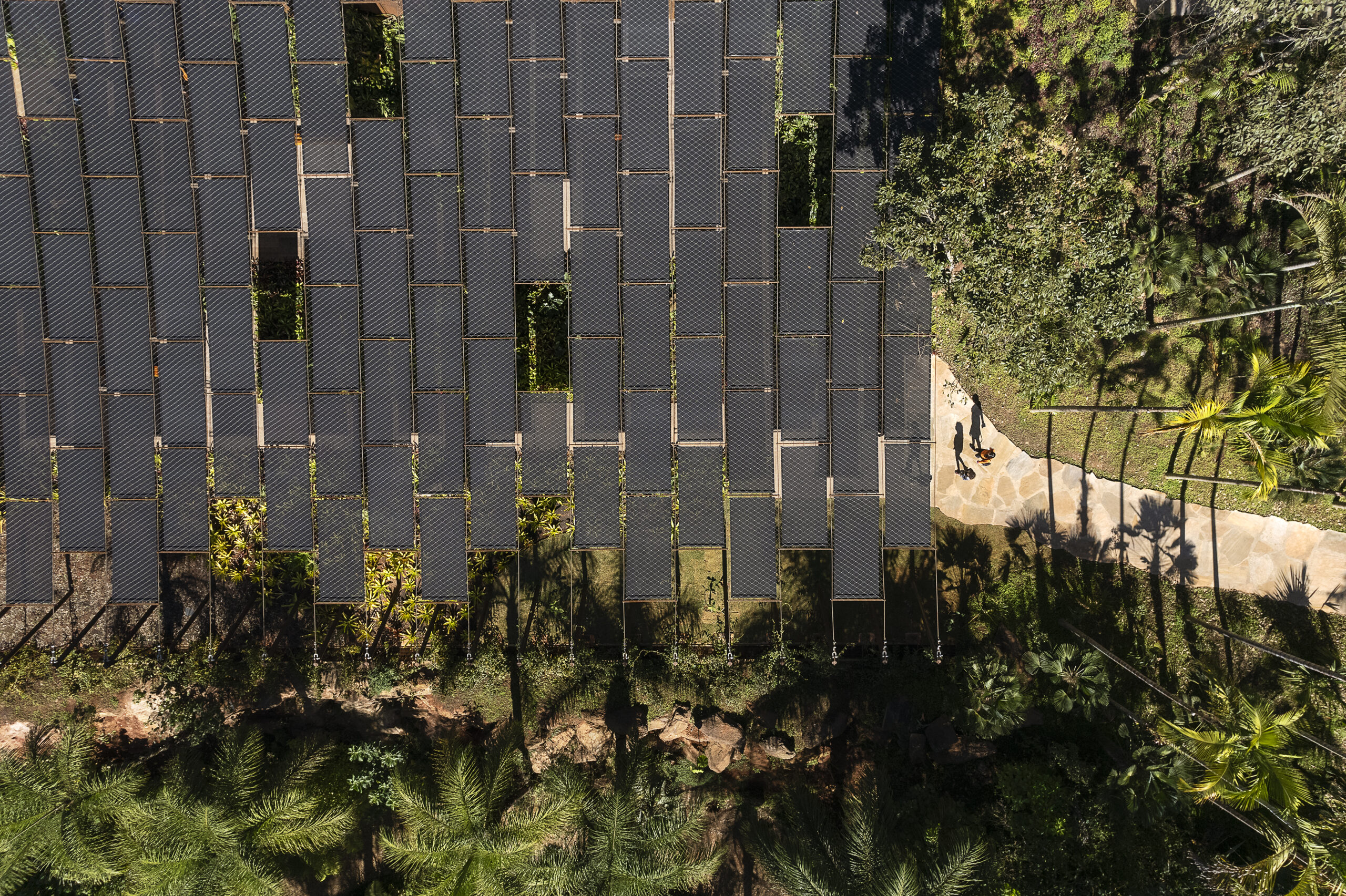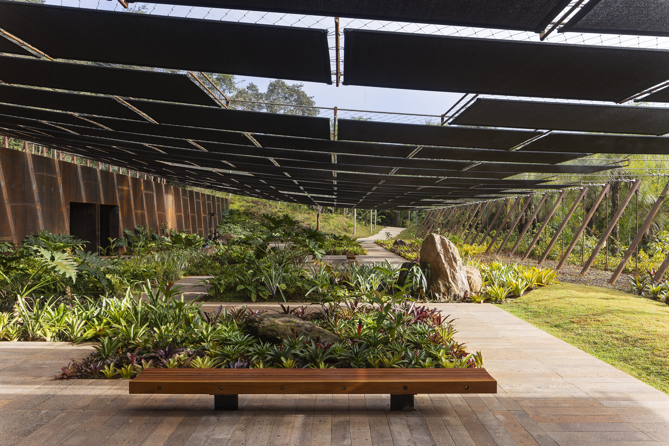 A Galeria Yayoi Kusama, em Inhotim (2023), abriga as obras “I am here but nothing” e “Aftermath of obliteration of eternity”. O projeto responde ao desafio de acolher não apenas as instalações, mas também o tempo de espera do público, criando um espaço de preparação para a experiência imersiva. Uma cobertura leve, tensionada por cabos de aço, recompõe o perfil natural do terreno e sustenta uma trepadeira Congea tomentosa, que traz sombra, textura e variação cromática. Integrada à topografia, a galeria se funde ao solo, conectando jardim e mata, arquitetura e paisagem.