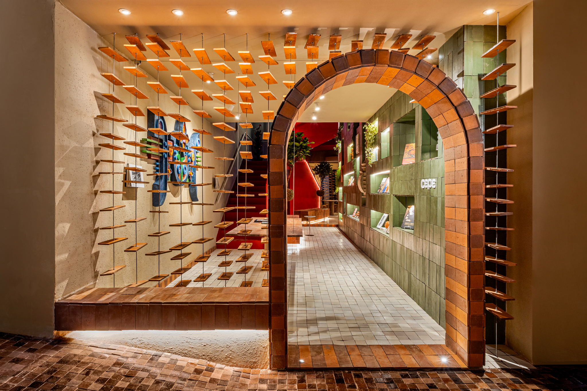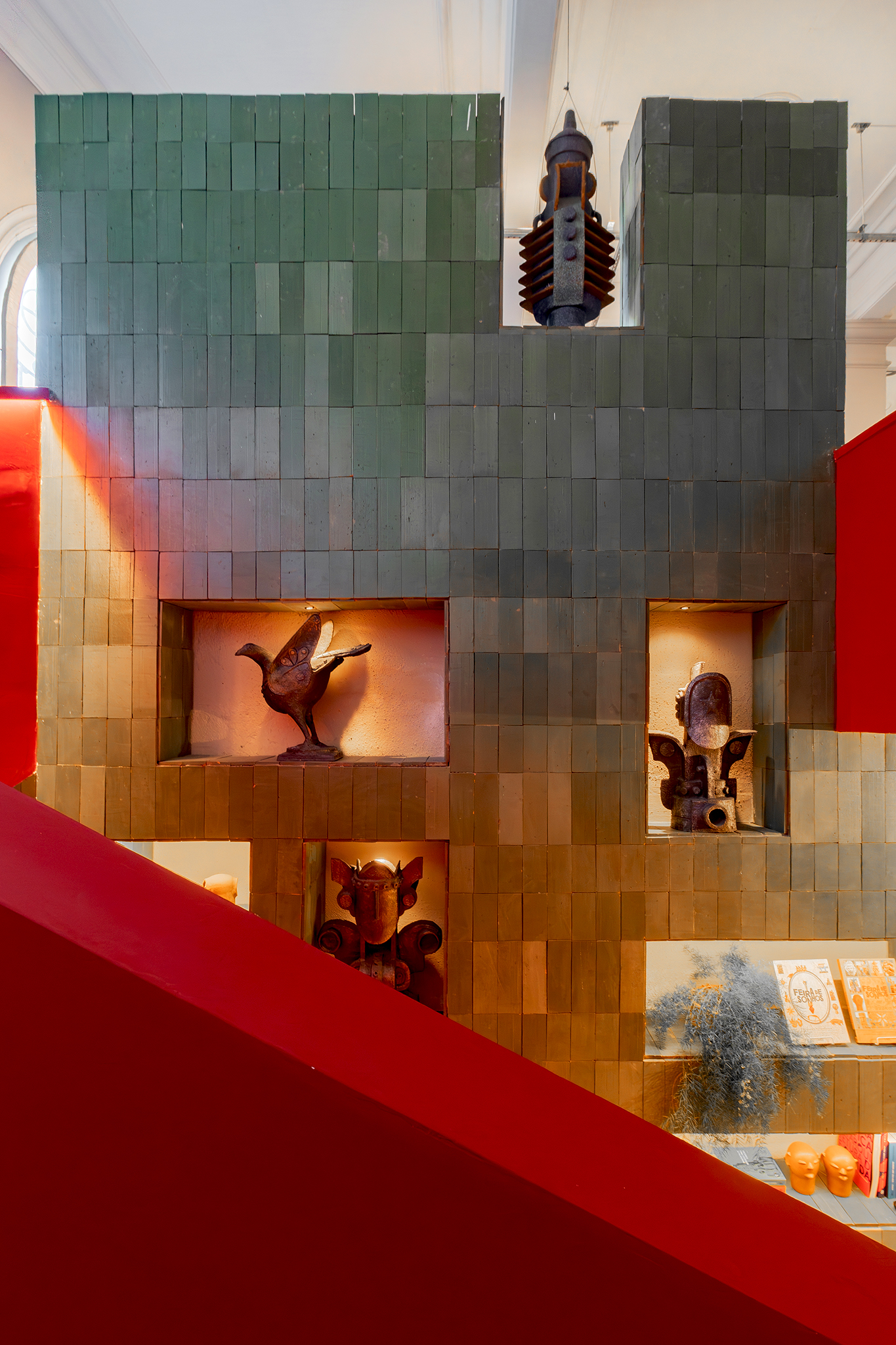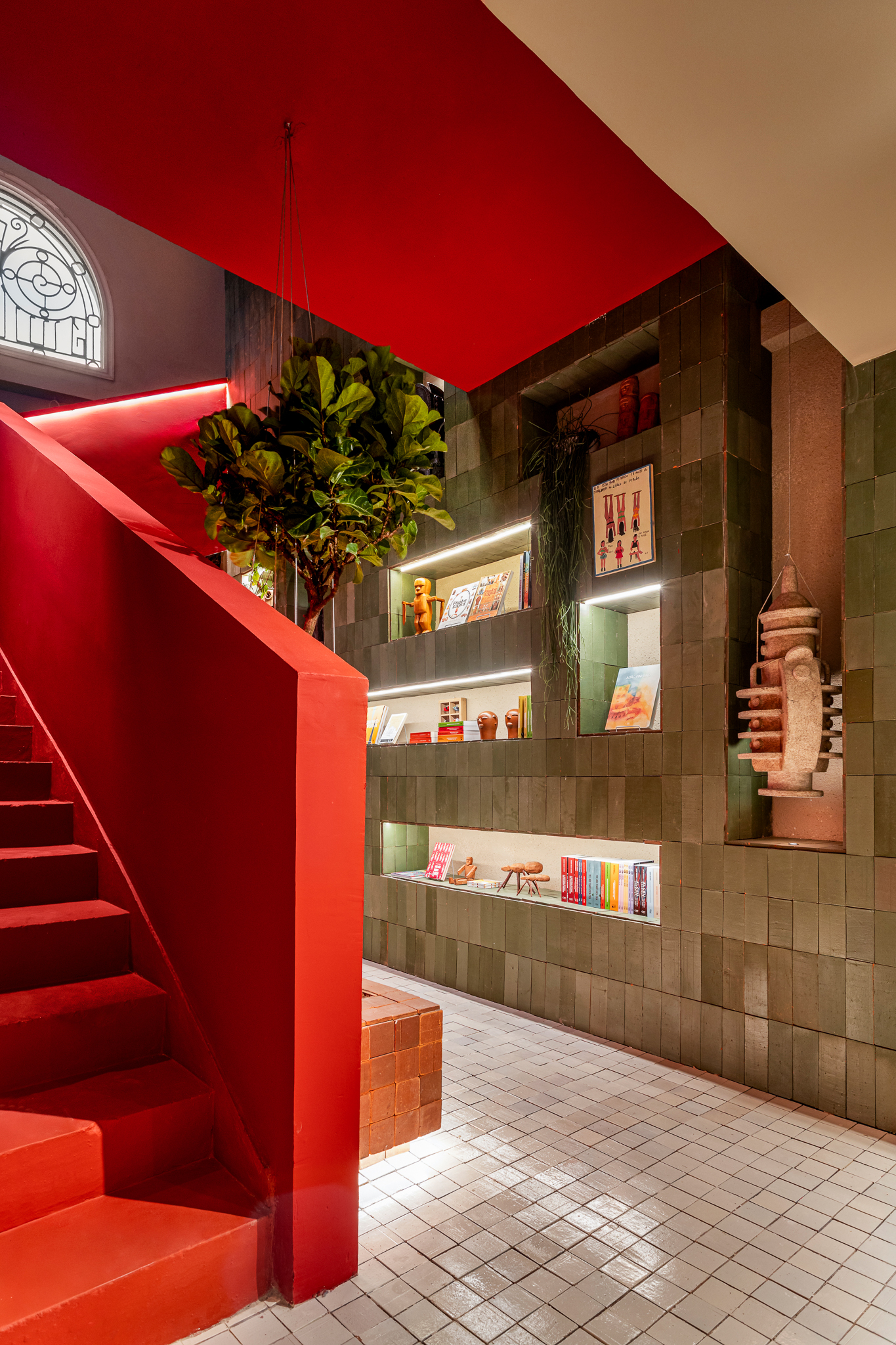 A vitrine do espaço apresenta um arco construído e revestido com placas cerâmicas em duas cores (Cacau e Terra), prestando homenagem a uma esquadria em arco do edifício histórico. Outro destaque na vitrine são as placas cerâmicas que parecem flutuar, presas por barras rosqueadas. Essas placas remetem a páginas de livros e acentuam a ideia do jogo de peso e leveza.