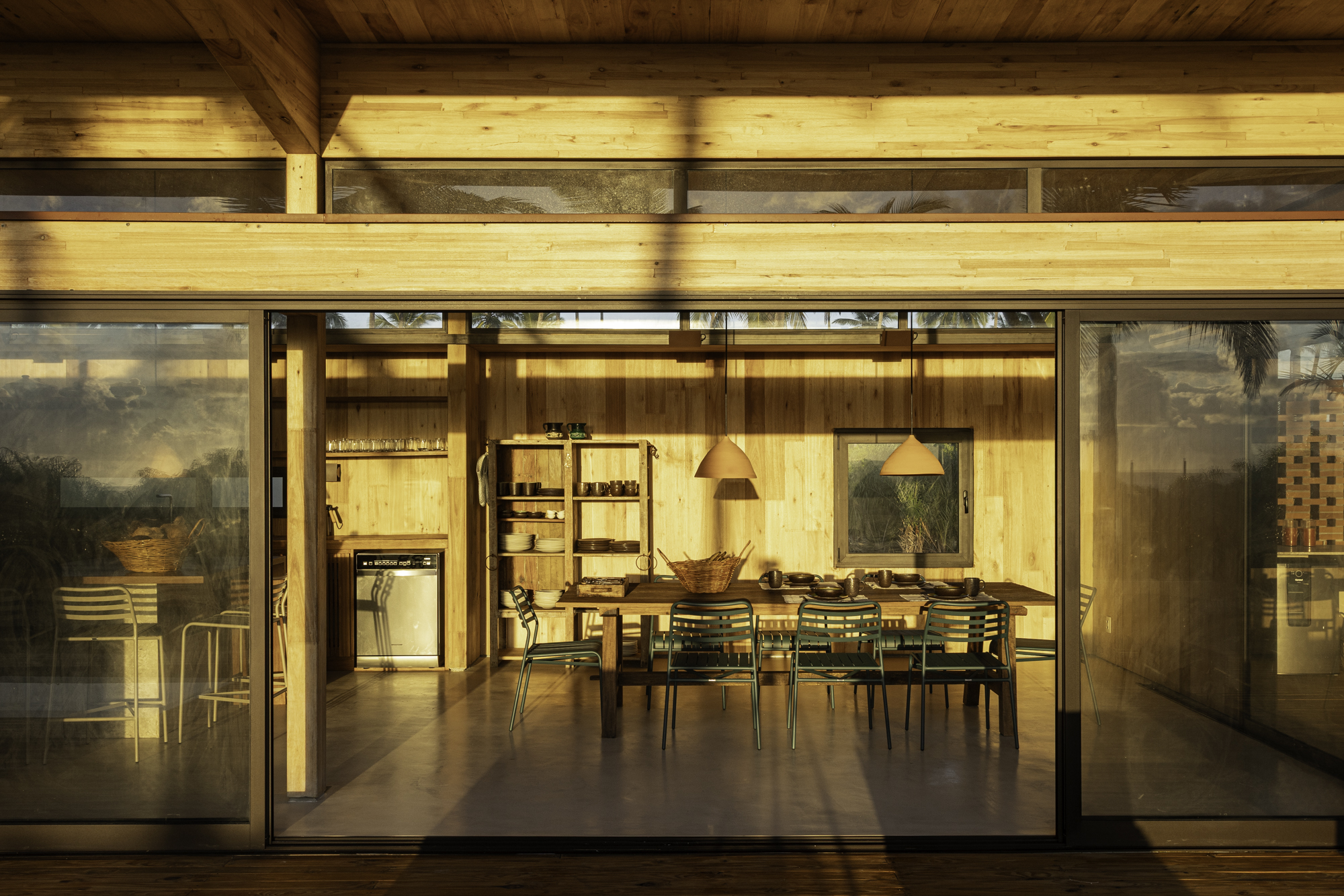 Implantado entre o rio e o mar, em meio a um coqueiral no litoral sul da Bahia, numa região conhecida como Costa do Cacau, o Modular Bahia é composto por três núcleos: dois autônomos, com dormitórios, pequena sala e cozinha, e um terceiro pavilhão social, com ampla cozinha, varanda e sala de jogos. O programa se organiza em seis pavilhões interligados por um deck de madeira suspenso do solo, integrando-se à vegetação e à paisagem local. O conjunto torna-se quase invisível a partir da praia ou do rio, preservando o aspecto natural do terreno.