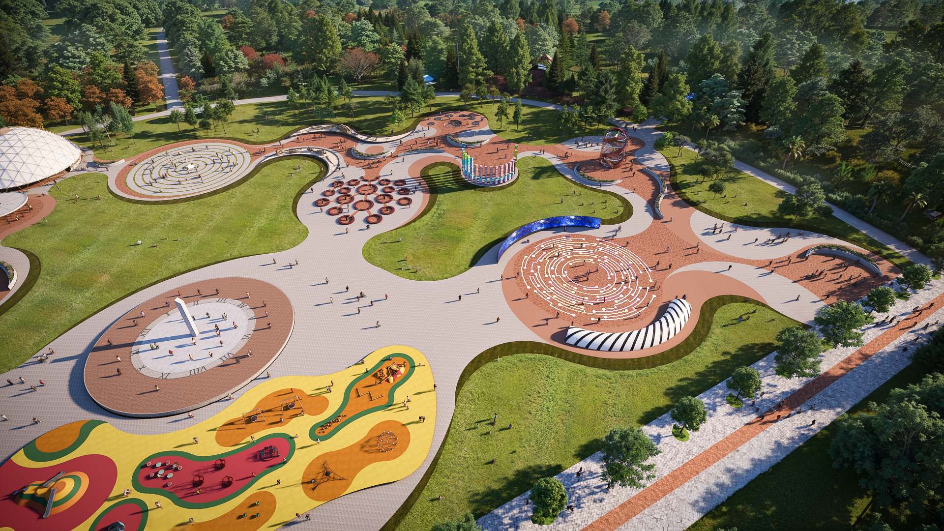 Seguindo esses princípios, propõe-se a expansão do parque, por meio de um Masterplan, com a criação de espaços abertos, voltados ao lazer, à convivência e à educação ambiental, com ênfase nas áreas verdes, no paisagismo e nos passeios. O projeto do Masterplan, ao buscar a integração harmoniosa entre natureza, arquitetura e tecnologia, se torna uma ferramenta cidadã, que estimula a curiosidade científica de crianças, jovens e adultos. Seu objetivo central é narrar a evolução do conhecimento humano por meio de uma experiência imersiva, na qual os visitantes são guiados por uma linha cronológica, desde o período pré-histórico até a era das tecnologias.