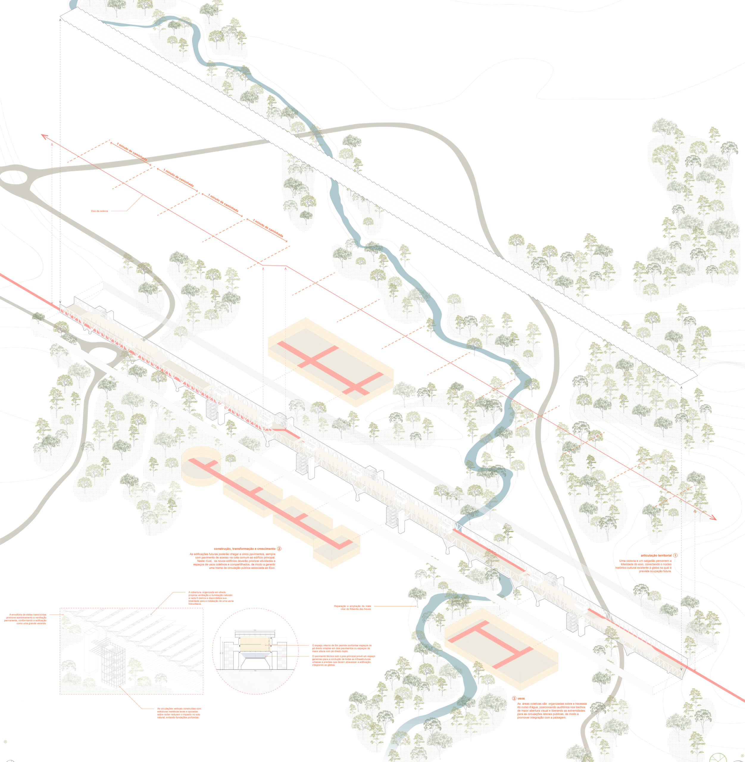 O Plano Diretor da Fazenda Modelo propõe um campus que alia urbanidade e sustentabilidade como princípios norteadores. Inserido junto ao centro urbano de Pedro Leopoldo, evita a urbanização extensiva e propõe uma infraestrutura linear elevada com alta flexibilidade e potencial de crescimento, conectando partes desarticuladas no território. Estruturado por diretrizes ambientais, históricas e paisagísticas, o campus propõe-se como uma plataforma inter e transdisciplinar, aberto e reconciliado com a natureza, reafirmando a universidade como agente de transformação que busca a exemplaridade.