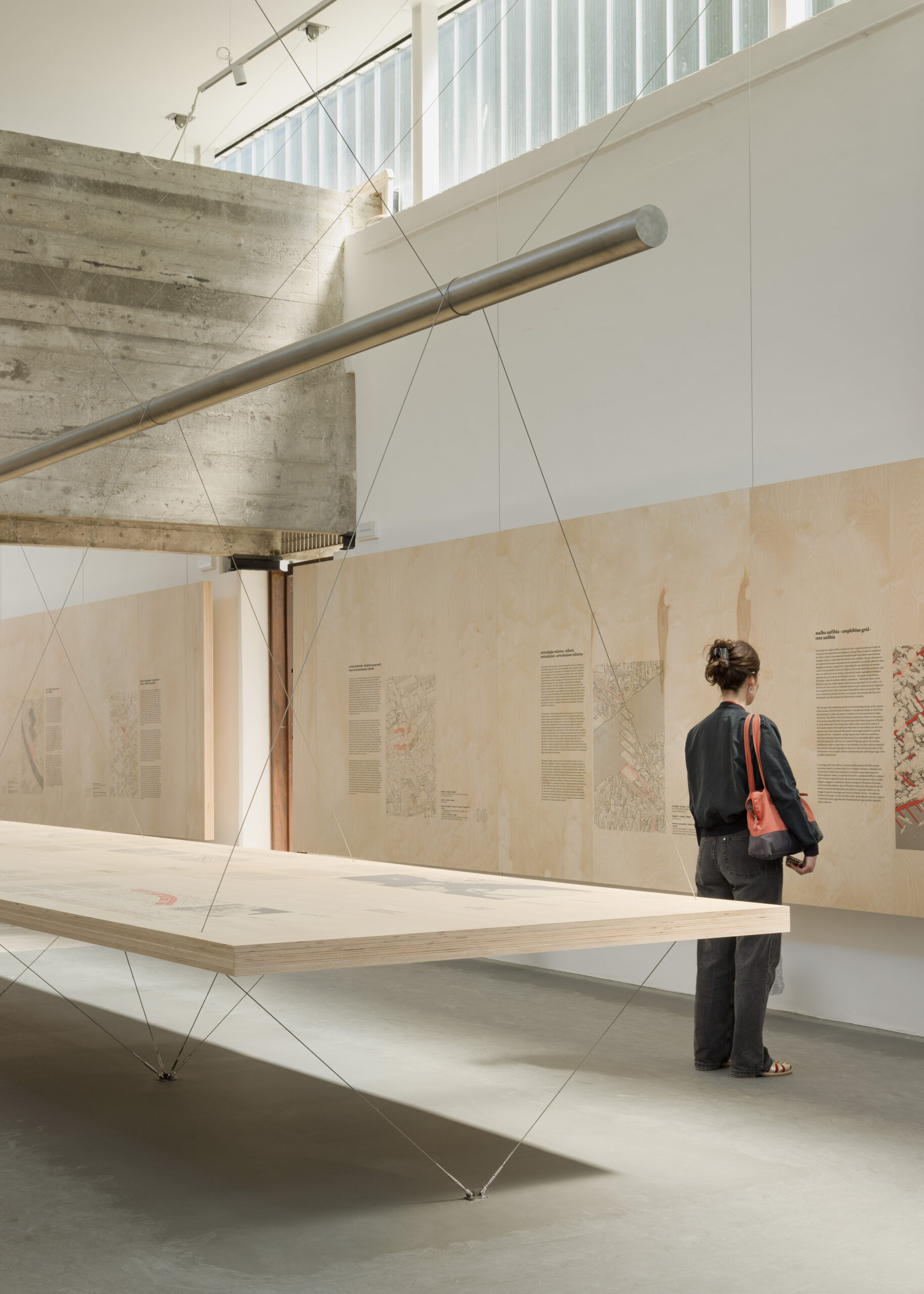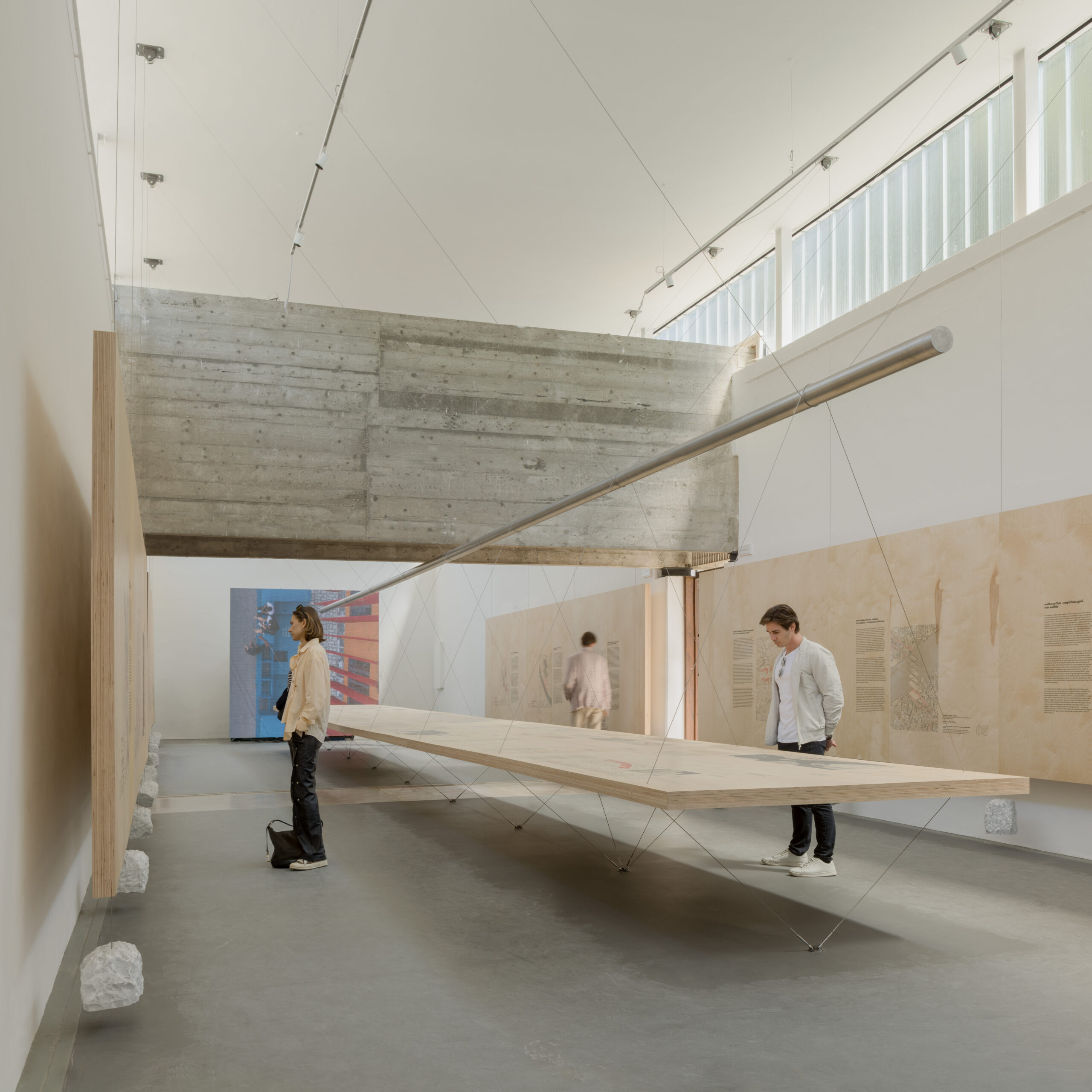 O segundo ato desloca o foco para a contemporaneidade, abordando as relações entre arquitetura, infraestrutura e cidade no Brasil atual. A instalação passa a operar em suspensão, a partir do equilíbrio entre painéis de CLT, pedras como contrapesos e cabos de aço, configurando um sistema estável regido por forças de ação e reação. A curadoria reúne pesquisas, processos e práticas que valorizam estratégias projetuais inventivas, abertas e sustentáveis, em detrimento de modelos rígidos.