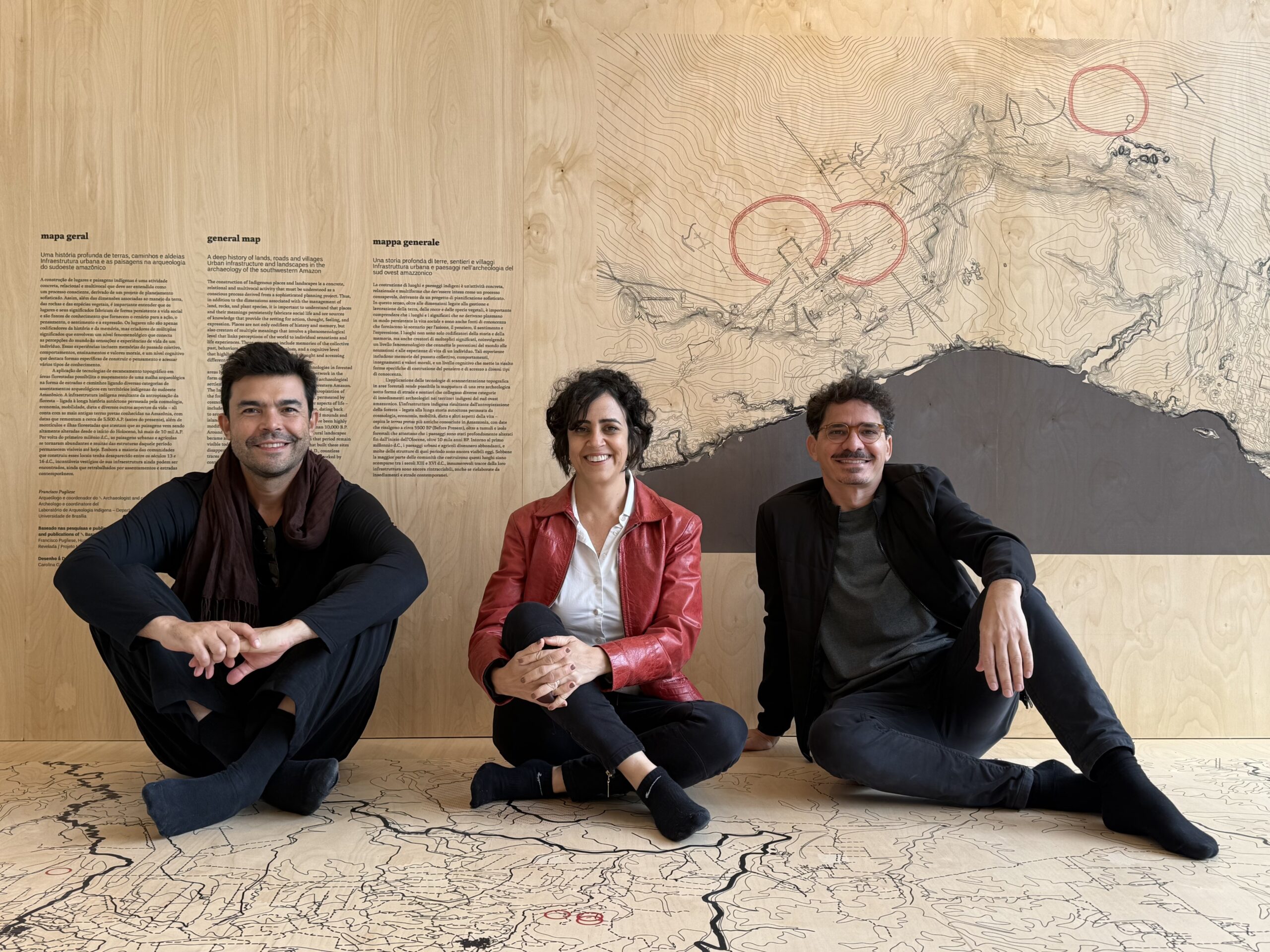 No primeiro ato, a instalação se organiza integralmente apoiada no chão e apresenta uma reflexão sobre as transformações do território brasileiro realizadas por povos indígenas ao longo de mais de 12 mil anos. A exposição evidencia como esses grupos desenvolveram infraestruturas sofisticadas, baseadas na integração entre técnica e natureza, resultando em paisagens construídas por meio de relações abertas, adaptativas e não controladoras. Exemplos como as terras pretas de índio revelam formas de engenhosidade ambiental e produção espacial profundamente conectadas ao meio.