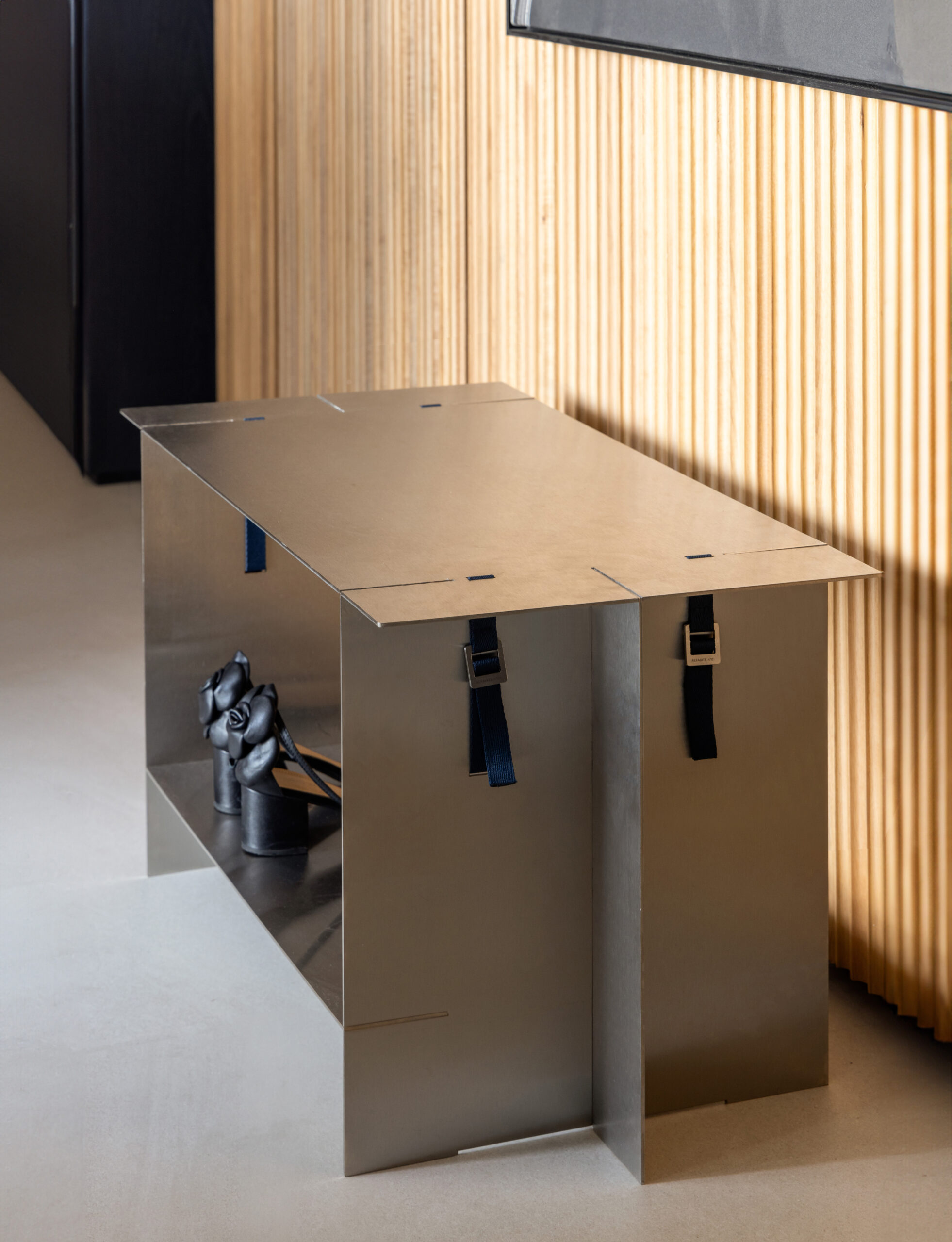 O Sistema Alfaiate parte do corte a laser de chapas de aço inoxidável para conformar componentes precisos, que se encaixam entre si sem a necessidade de solda. O travamento final se dá por meio de percintas de poliéster com fivela personalizada, inspiradas em técnicas do vestuário, que “amarram” a estrutura e garantem estabilidade. A lógica construtiva converte o mobiliário em um sistema desmontável, eficiente e acessível, permitindo que o usuário finalize a montagem de forma simples e intuitiva.