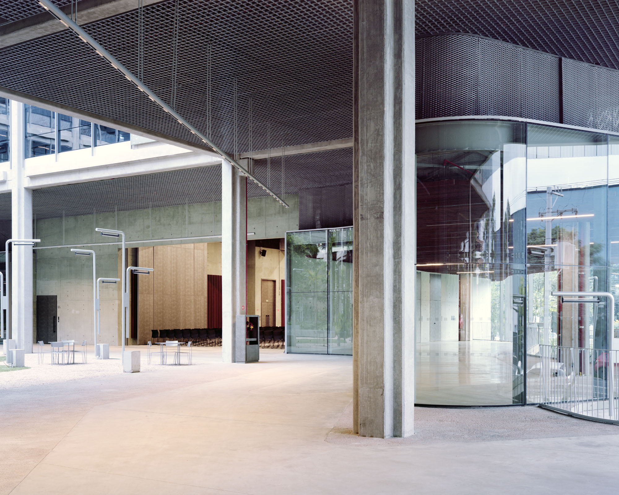 Organizado pela repetição modular em grid de 11,25 metros, o edifício comporta cinco pavimentos e adapta sua forma às demandas programáticas e às condicionantes do terreno, criando terraços em múltiplos níveis que borram as fronteiras entre paisagem construída e paisagem urbana. Um véu metálico perfurado envolve o conjunto como membrana filtrante, enquanto grandes superfícies de vidro dissolvem limites e fragmentam percepções entre dentro e fora.